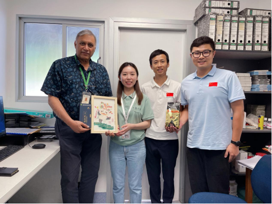 援巴布亚新几内亚医疗队向巴新大学医学院口腔学院院长Dr.Siddiqi赠送版画(左2为我校教师江瑶)