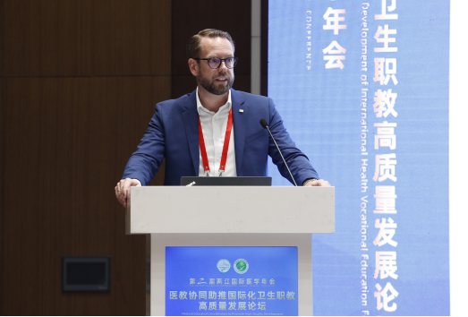 论坛分为五场主题报告,国内外专家分享了各自领域的前沿理念和实践经验。德国阿莎芬堡-阿尔泽瑙教学医院总经理塞巴斯蒂安•利奥波德•累欧茨基先生以“变革性医疗卫生始于杰出人才”为题,深入探讨了德国护理教育的先进模式;老挝健康科学大学校长梅丰•梅赛先生介绍了“人才班”培养模式在老挝医学教育中的创新实践;上海交通大学医学院附属瑞金医院崔文国教授从国际化科研平台建设和高端医学人才培养的角度,分享了中国的宝贵经验;新加坡南洋理工学院健康与社会科学学院院长蔡添喜先生聚焦“合作式护理教育”,展示了新加坡职业教育与产业需求无缝衔接的成功案例;我校党委委员、副校长兰作平以“实施多维多边合作,共育国际化医药卫生急需人才”为题,系统阐述了学校的国际化办学成果与未来规划。