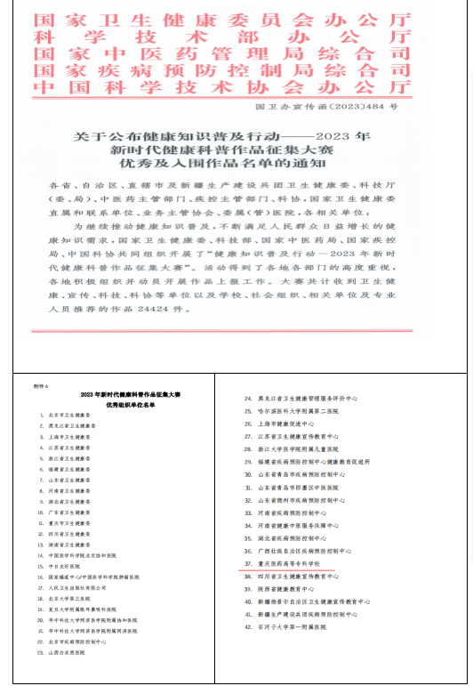 近日,由国家卫生健康委联合科技部、国家中医药局、国家疾控局、中国科协共同举办的“健康知识普及行动—2023年新时代健康科普作品征集大赛”结果公布,我校七项参赛作品获奖,学校获优秀组织奖。
