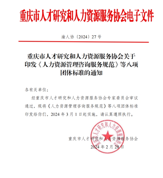 2月28日,重庆市人才研究和人力资源服务协会正式发布《人力资源管理咨询服务规范》等八项团体标准,其中两项为我校牵头起草制定。此八项标准将于2024年3月1日正式实施。