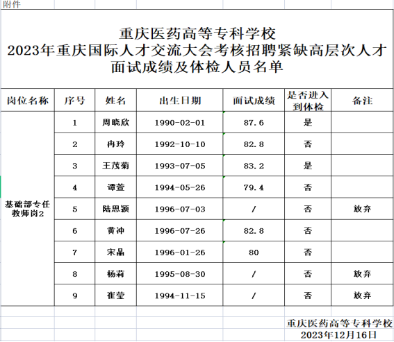 根据《澳门电子pg游戏官网关于公布2023年重庆国际人才交流大会考核招聘紧缺高层次人才面试成绩及进入体检环节人员名单的通知》要求,基础部专任教师岗2应聘人员周晓欣、王茂菊应进入体检环节,现因周晓欣放弃体检及后续环节,王茂菊放弃政审及后续环节,将成绩并列第三名的方冉玲、黄冲递补进入体检环节。(详情如下图)