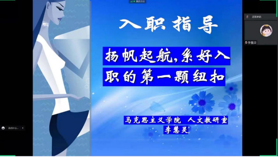 本次课程的主讲人马克思主义学院人文教研室专职教师李慧灵主要从角色转换与职业适应,和谐人际关系的建立,职业压力,理性对待跳槽等四个维度阐述了作为一名职场新人如何适应职场生活。李老师提到,理性分析自身利弊,合理定位职业方向是成功实现高质量就业的前提,建立科学合理的职业生涯规划有利于我们进入职场后完美实现从学生到社会人、职业人的角色转换,如何快速融入职场,如何处理职场中的人际关系依然是初出茅庐的新职业人需要学习的基本技能。