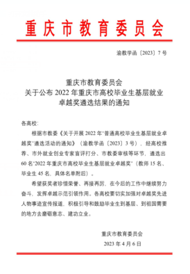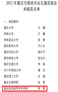 近日,重庆市“2022年普通高校毕业生基层就业卓越奖”评选活动圆满落幕,我校优秀教师郭娇和优秀毕业生邹俊杰荣获重庆市“2022年普通高校毕业生基层就业卓越奖”。