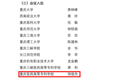 邹俊杰,中共党员,代理连长,我校医学技术学院眼视光技术专业2017届毕业生,2018年考入武警工程大学,多次被评为“优秀义务兵”、“优秀学员”, 2022被评为“四有”优秀警官并荣获嘉奖一次,现服役于武警重庆总队某部。