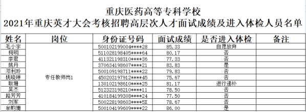 根据《2021重庆英才大会事业单位考核招聘高层次人才公告》,我校招聘岗位专任教师岗1招聘计划3人,其中,牟畇珊、毛小宇、姚丹3人综合成绩排名前3,已进行体检。但在进行考察前,毛小宇自愿放弃考察及后续环节。现经市卫健委同意,学校决定进行递补。