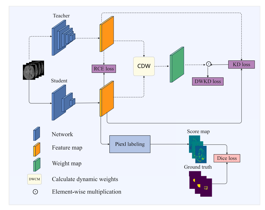 近日,beat365正版唯一官网必一于彬教授团队在医学图像研究领域取得重要进展,相关成果以“Dynamic weighted knowledge distillation for brain tumor segmentation”为题发表在人工智能领域的顶级期刊Pattern Recognition(中科院一区TOP期刊,影响因子7.5)。于彬教授为论文的唯一通讯作者,2021级研究生安典龙为第一作者,beat365正版唯一官网必一为第一完成单位。