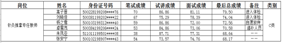 根据《澳门电子pg游戏官网2020年上半年公开招聘工作人员成绩及进入体检人员名单的通知》要求,C类岗位针灸推拿专任教师应聘人员杨之雪应进入体检环节,因杨之雪本人放弃体检及后续环节,将成绩为第四名的卓雪茂依次递补进入体检环节。(详情如下图)