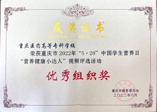 为进一步加强学生膳食营养及食品安全知识教育,提升学生营养健康素养,重庆市教育委员会举办了的2022年“5•20”中国学生营养日“营养健康小达人”视频评选活动。我校广泛宣传动员,认真组织了校内评选,并按照市教委要求报送了2个作品参赛。临床医学院张诗悦等同学的作品《食油争霸》获高校组一等奖,基础部谢豪杰等同学的作品《“瘦瘦”与“胖胖”的一天》获高校组二等奖。学校荣获“优秀组织奖”,并获得“优秀组织者奖”1项、“优秀指导教师奖”2项。