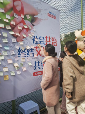 活动现场,学校禁毒防艾宣讲团成员们精心设计活动方案,以完成任务大闯关的形式,开展了形式多样、师生喜闻乐见的宣传教育活动,现场师生踊跃参与,活动氛围热烈非凡。活动设立了“社会共治,终结艾滋,共享健康”主题签名墙,号召师生参与签名,写下心语,勇担防艾职责,合力共抗艾滋。现场还开展了“‘艾’就转起来”知识闯关有奖答题活动、“知艾防艾”优秀四格漫画图片展,“关艾”打卡等活动。防艾志愿者为同学们发放艾滋病防控宣传手册并耐心讲解艾滋病防控知识,引导同学们积极行动起来,预防艾滋,做自身健康的第一责任人。
