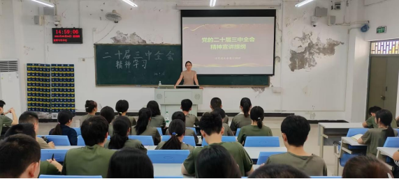 党总支书记杨海英深入23级护理军士班,为定向军士生讲“学习贯彻党的二十届三中全会精神”专题党课。杨海英讲到,学习贯彻好党的二十届三中全会精神,是当前和今后一个时期全党全国的一项重大政治任务。这次全会全面回顾总结了党的二十届二中全会以来中央政治局的工作,高度评价了新时代以来全面深化改革的成功实践和伟大成就,全会通过的《中共中央关于进一步全面深化改革、推进中国式现代化的决定》充分彰显了以习近平同志为核心的党中央将改革进行到底的坚强决心和强烈使命担当,对于全党进一步统一思想、统一意志、统一行动,在新征程上朝着全面建成社会主义现代化强国的宏伟目标奋勇前进,具有重大而深远的意义。
