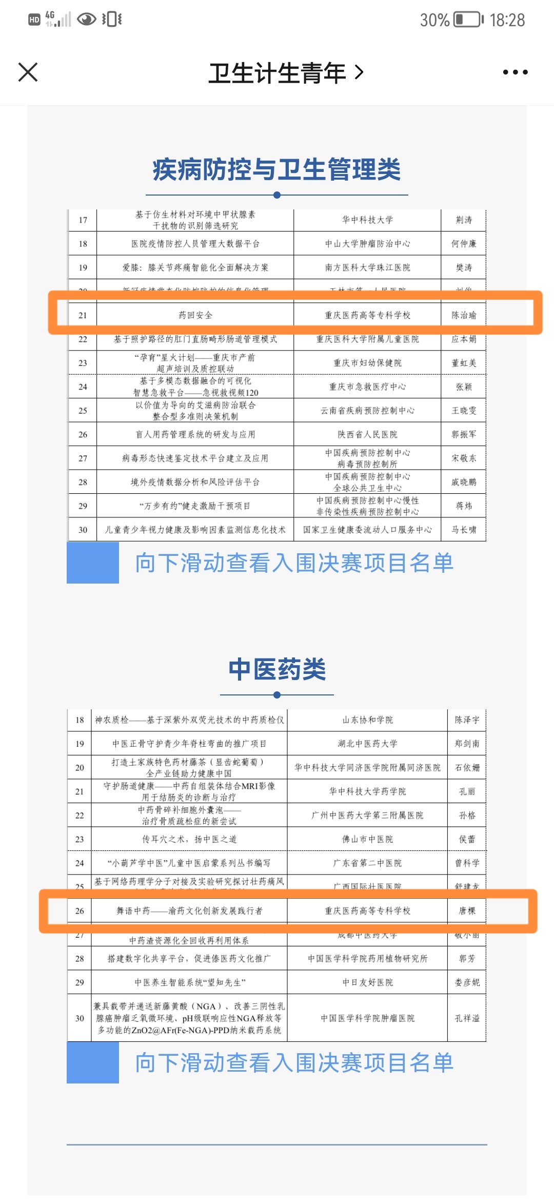近日,由共青团中央青年发展部、国家卫生健康委文明办、中国青年创业就业基金会主办,国家卫生健康委直属机关团委、卫生健康青年创新中心承办的第八届“创青春”中国青年创新创业比赛卫生健康行业专项赛暨首届全国卫生健康行业青年创新大赛公布入围决赛名单。我校《药回安全》和《舞语中药——渝药文化创新发展践行者》两个项目分别入围“创青春”首届全国卫生健康行业青年创新大赛决赛疾病防控与卫生管理赛道、中医药赛道。