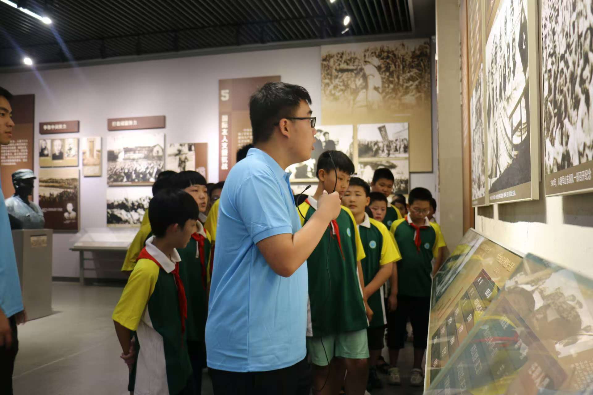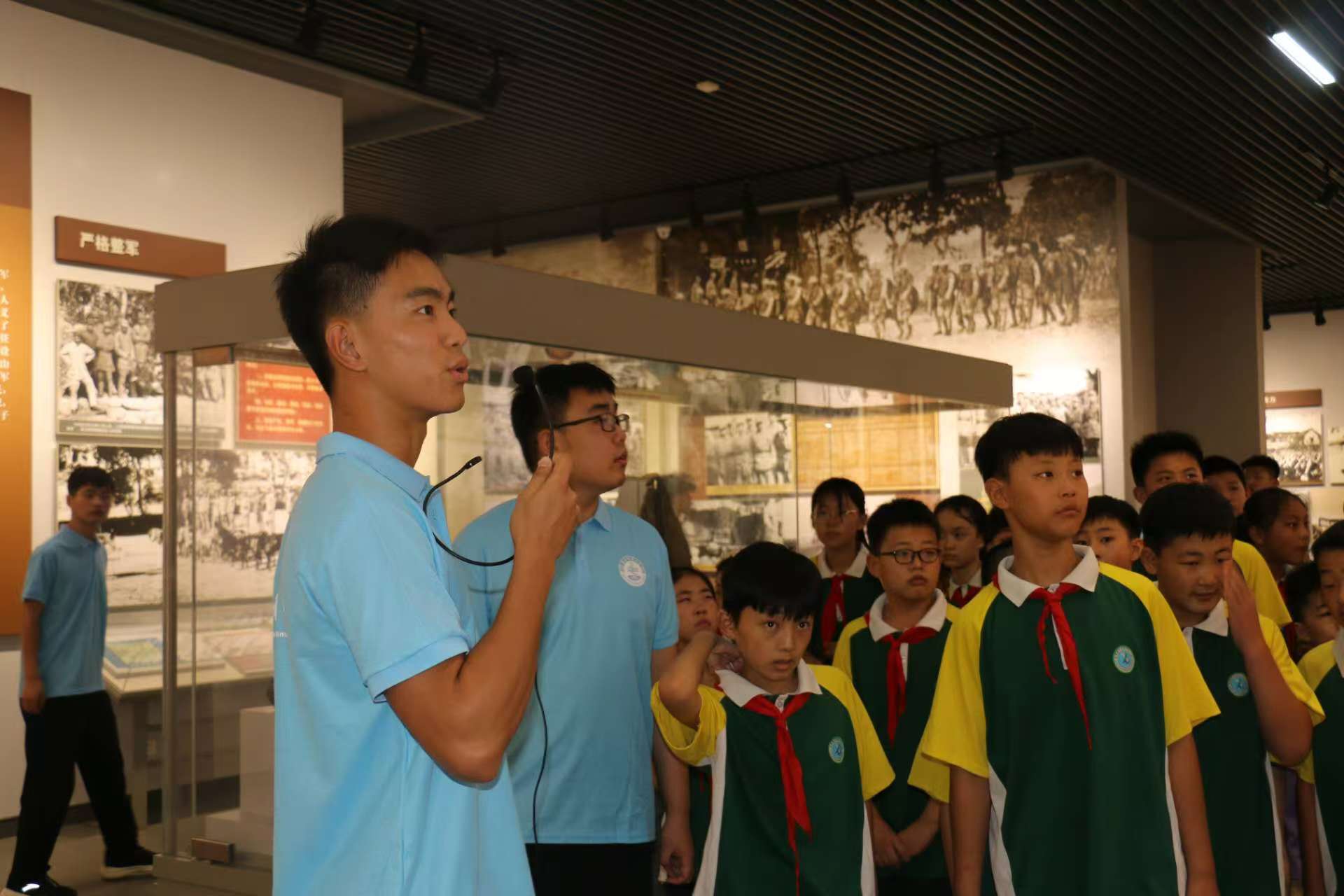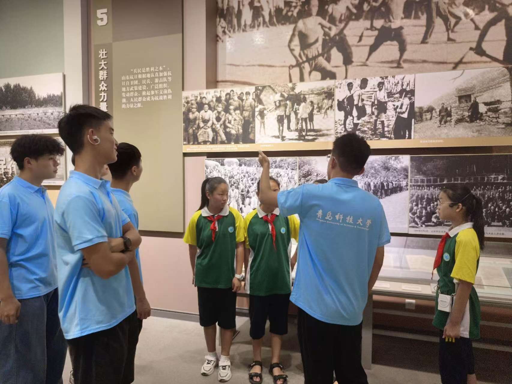 7月28日一早,宣讲团成员就带领大店镇中心小学的少先队员们走进了山东省政府旧址,仔细感受那段艰苦抗战的历史。大学生和小学生一起,共同追忆峥嵘岁月,追寻沂蒙大地上的革命足迹。一幅幅照片、一件件展品、一个个英雄人物、一段段革命事迹,让少先队员们在感受战争气息、体味血浓于水的同时,更加坚定了爱国主义信念,讲到动情处,禁不住热泪盈眶。