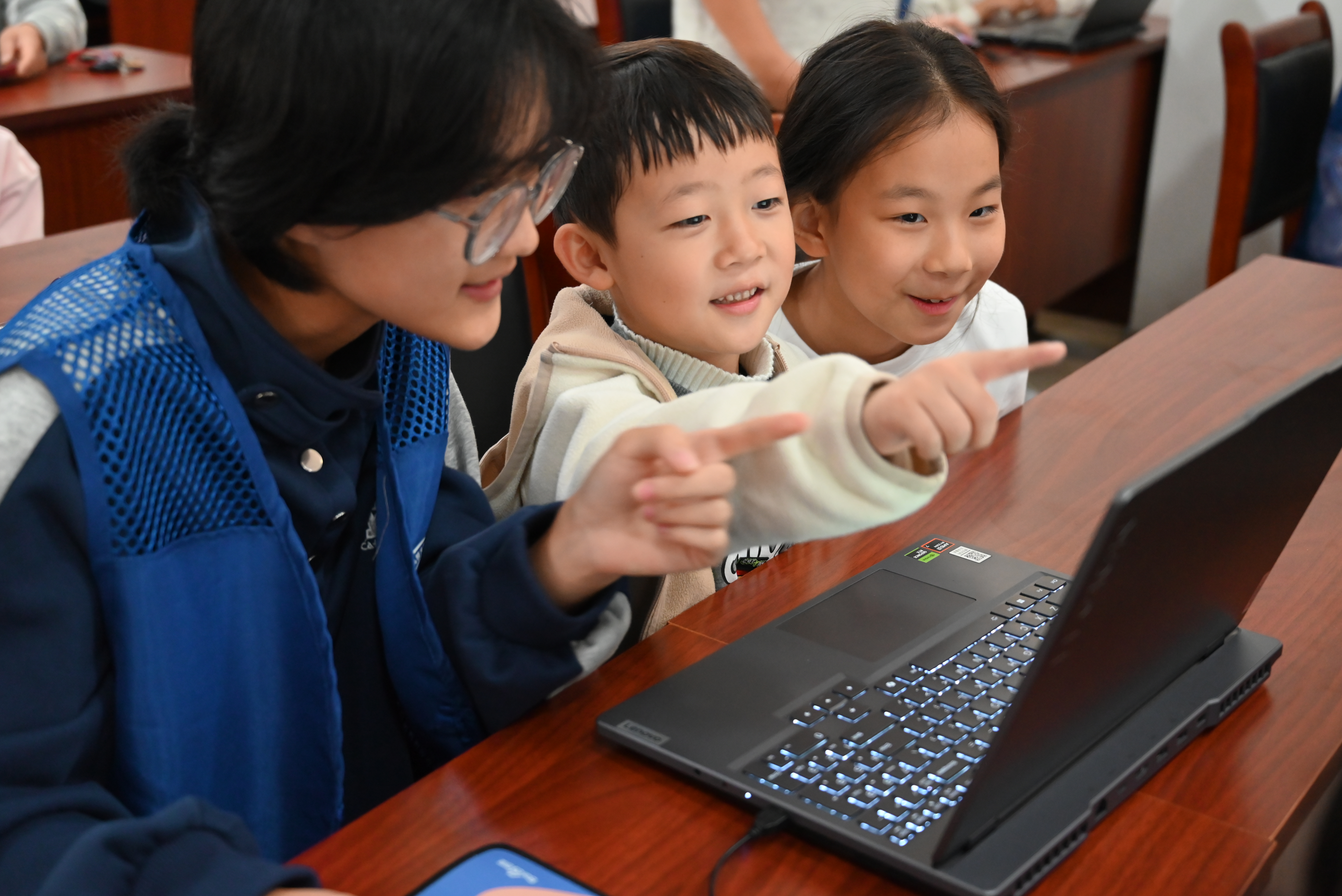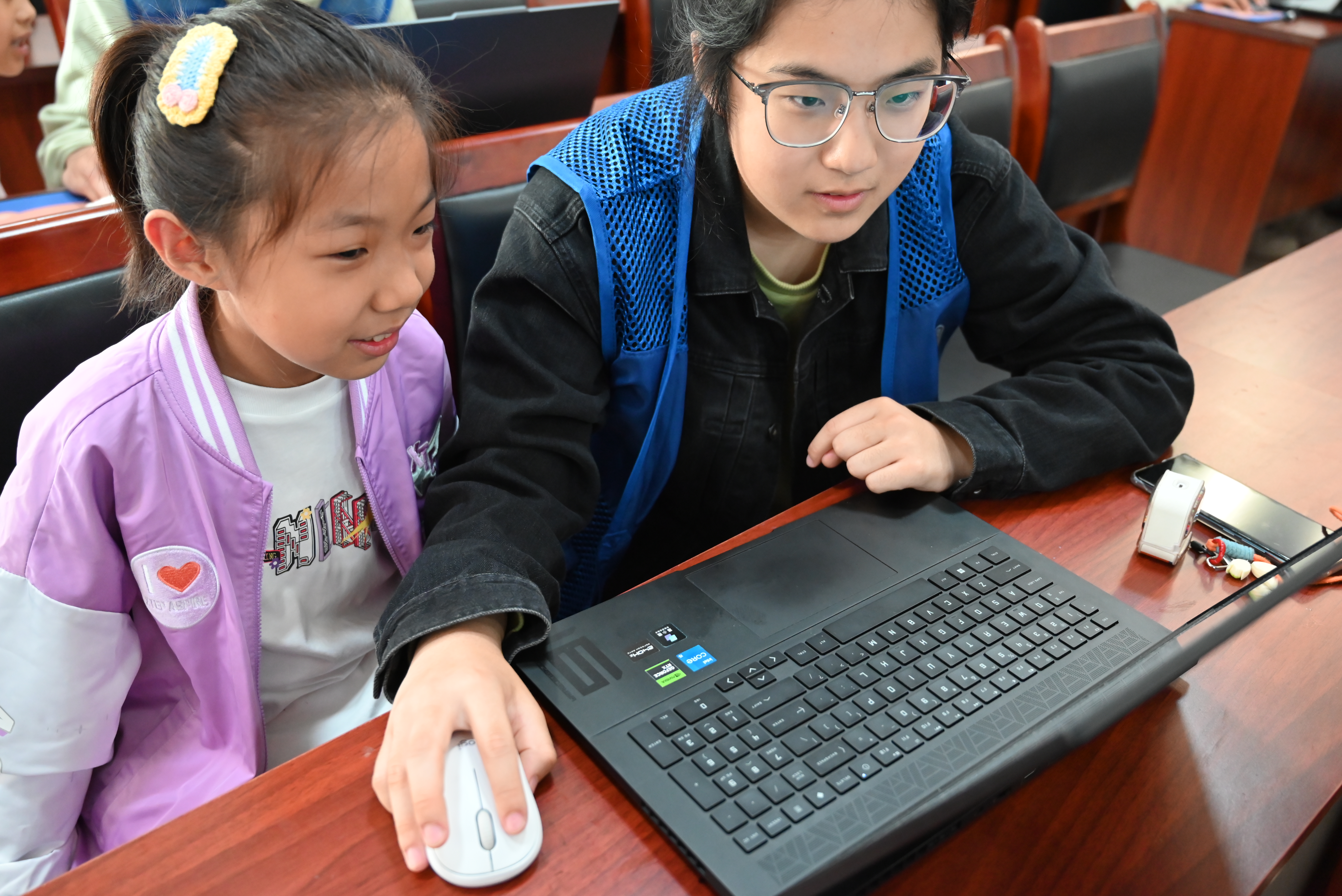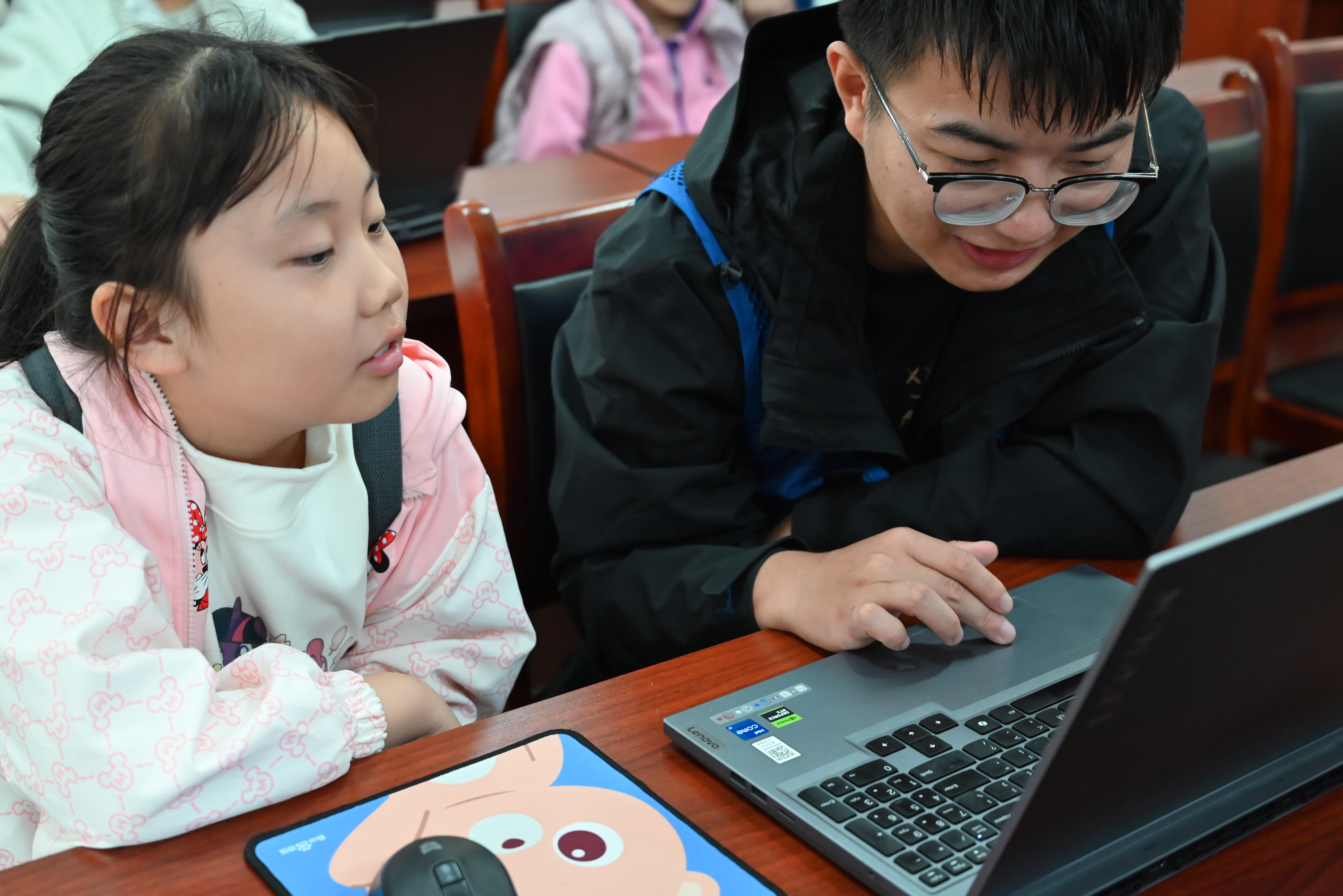 面向低年级小朋友的志愿者则重点讲授scratch的第二章与第三章“翱翔的小鸟”内容。志愿者们操作着电脑,展示着色彩斑斓的编程界面和可爱的小鸟形象,一步一步引导孩子们如何通过编程让小鸟在屏幕上自由翱翔。孩子们的小手在键盘上欢快地跳跃,每一次敲击都带着对创造的热情,现场充满了欢声笑语。