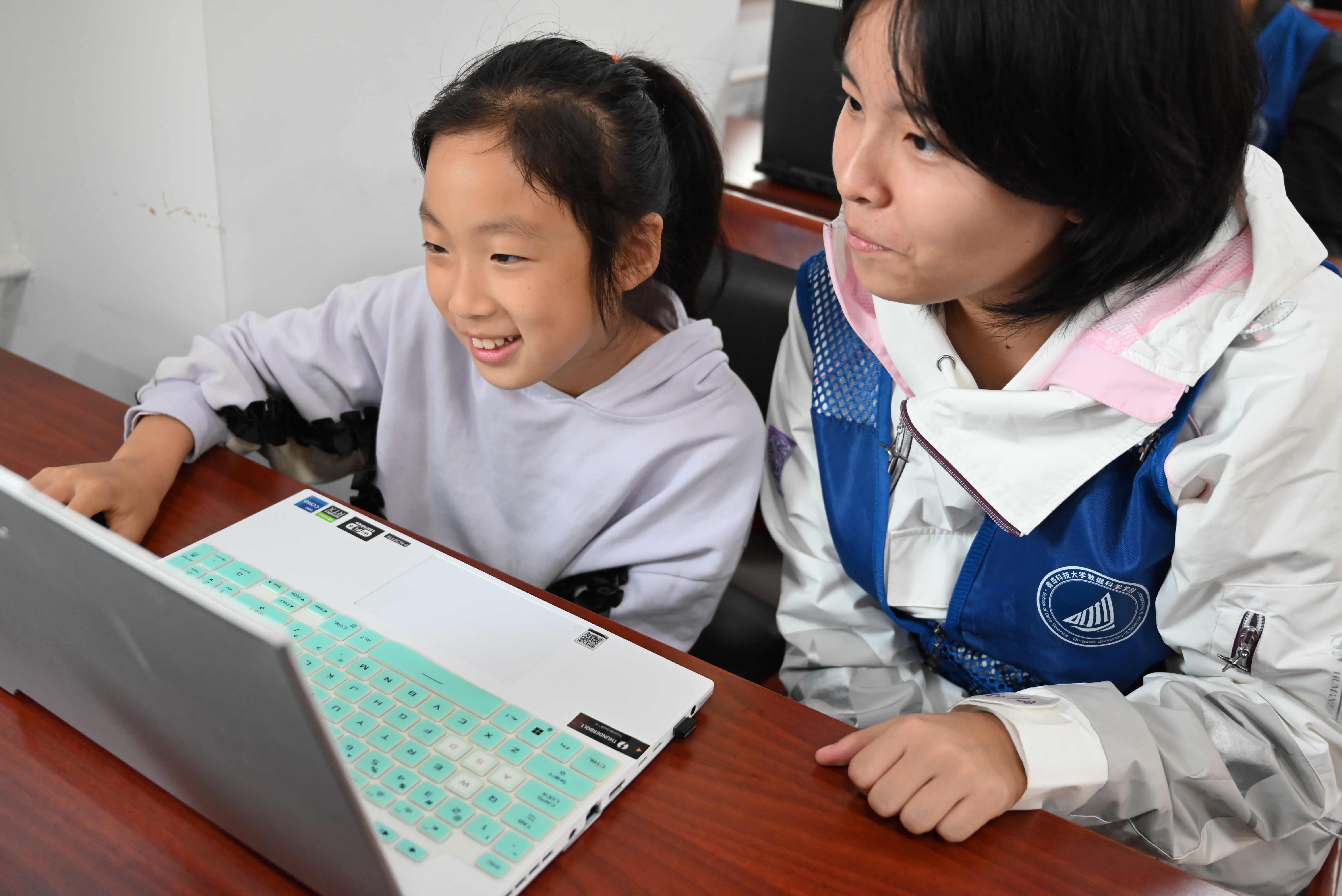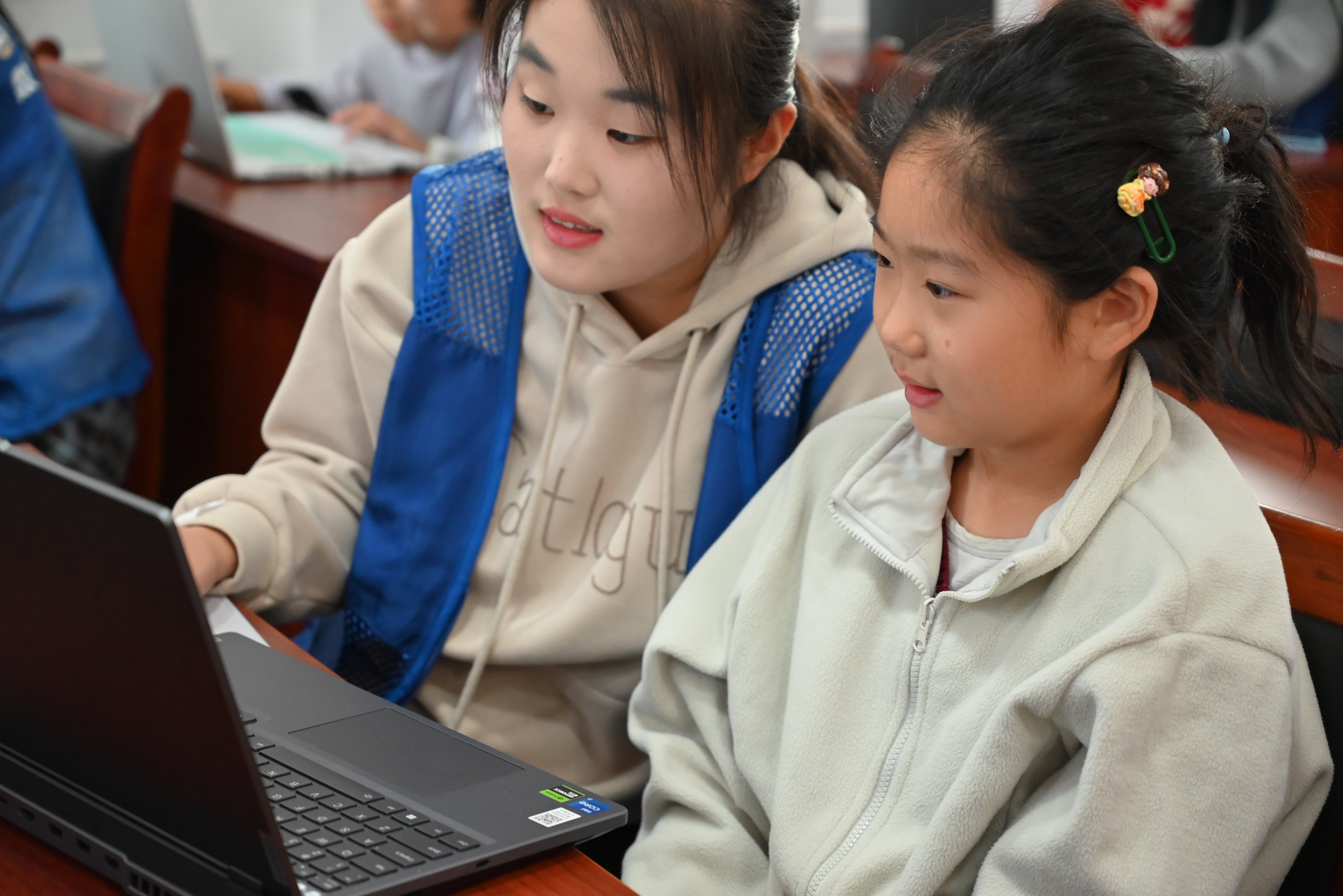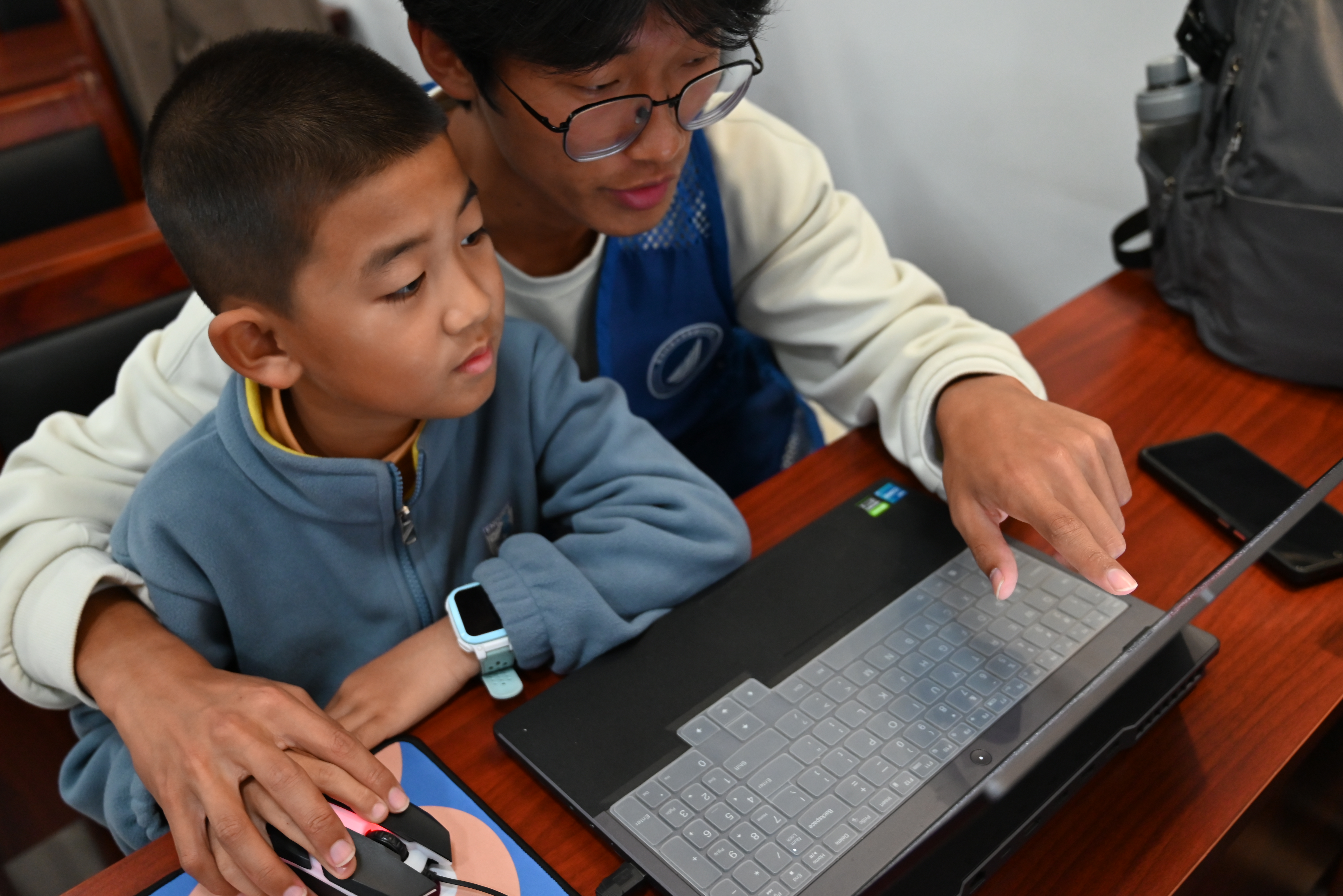 面向低年级小朋友的志愿者则重点讲授scratch的第二章与第三章“翱翔的小鸟”内容。志愿者们操作着电脑,展示着色彩斑斓的编程界面和可爱的小鸟形象,一步一步引导孩子们如何通过编程让小鸟在屏幕上自由翱翔。孩子们的小手在键盘上欢快地跳跃,每一次敲击都带着对创造的热情,现场充满了欢声笑语。