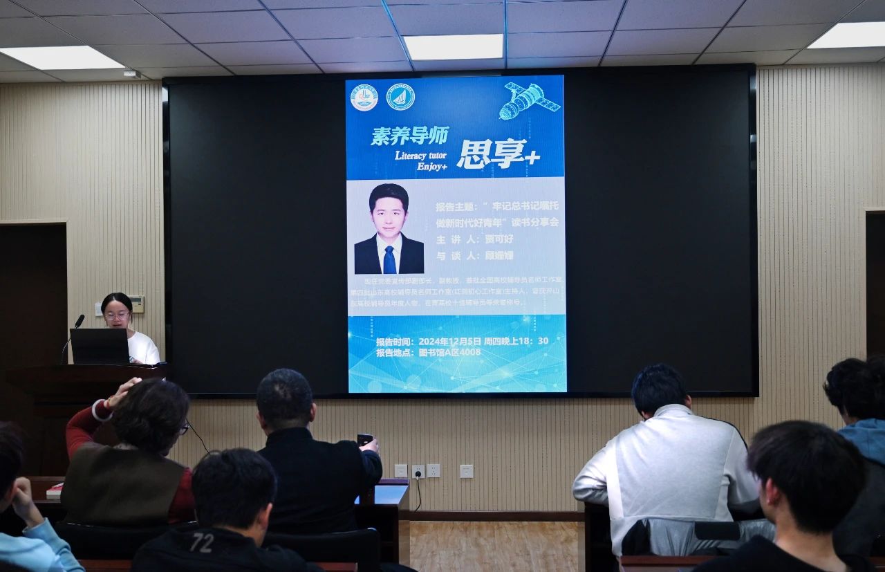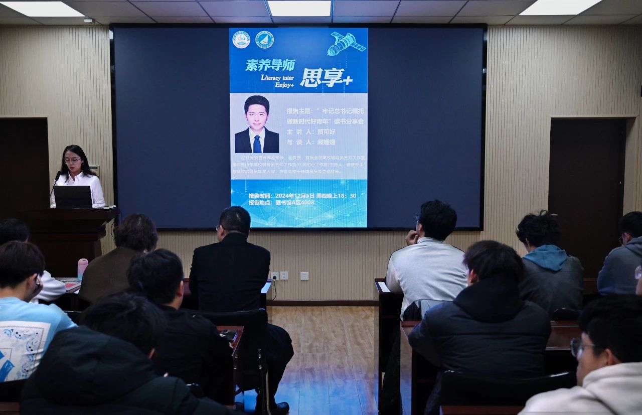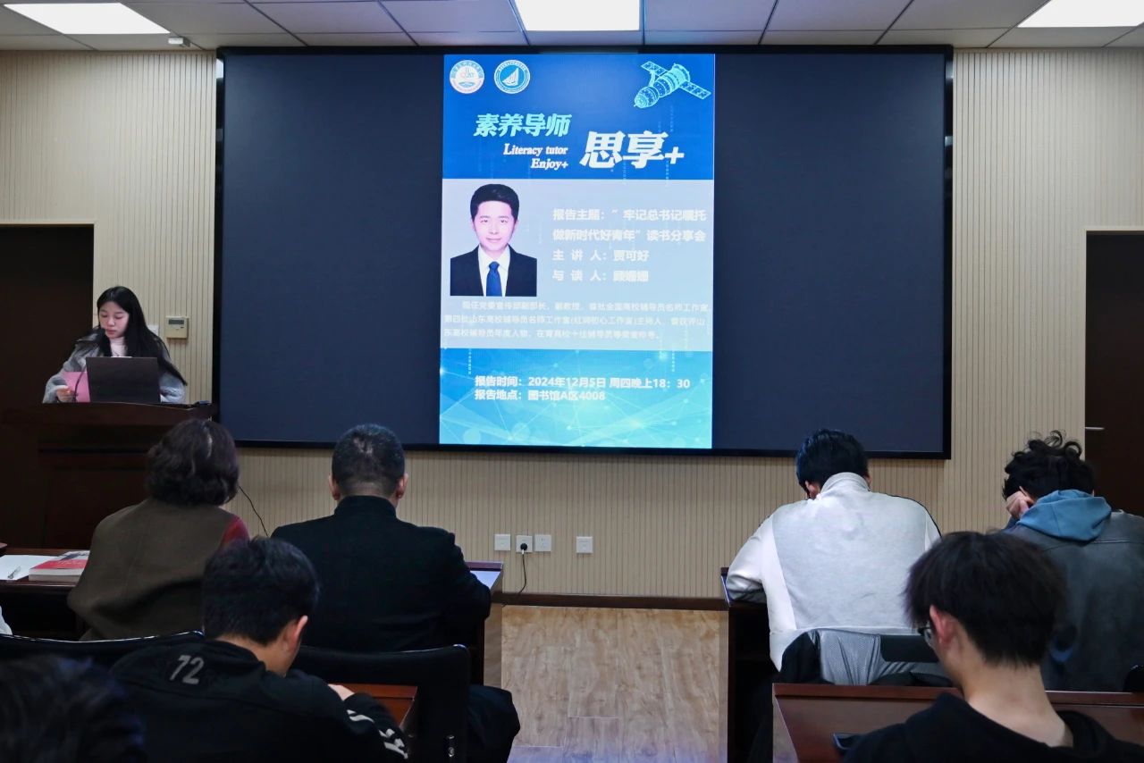 12月5日晚上,beat365正版唯一官网必一在学院楼4008会议室顺利开展了“素养导师思享+”第九期素养课程——“牢记总书记嘱托做新时代好青年”读书分享会。此次课程邀请到学校党委宣传部副部长、副教授贾可好担任主讲嘉宾,马克思主义专业研究生朱彦祯、艺术学院本科生王莉汶作为分享嘉宾,学院2023级和2024级部分本科生参与此次分享会。