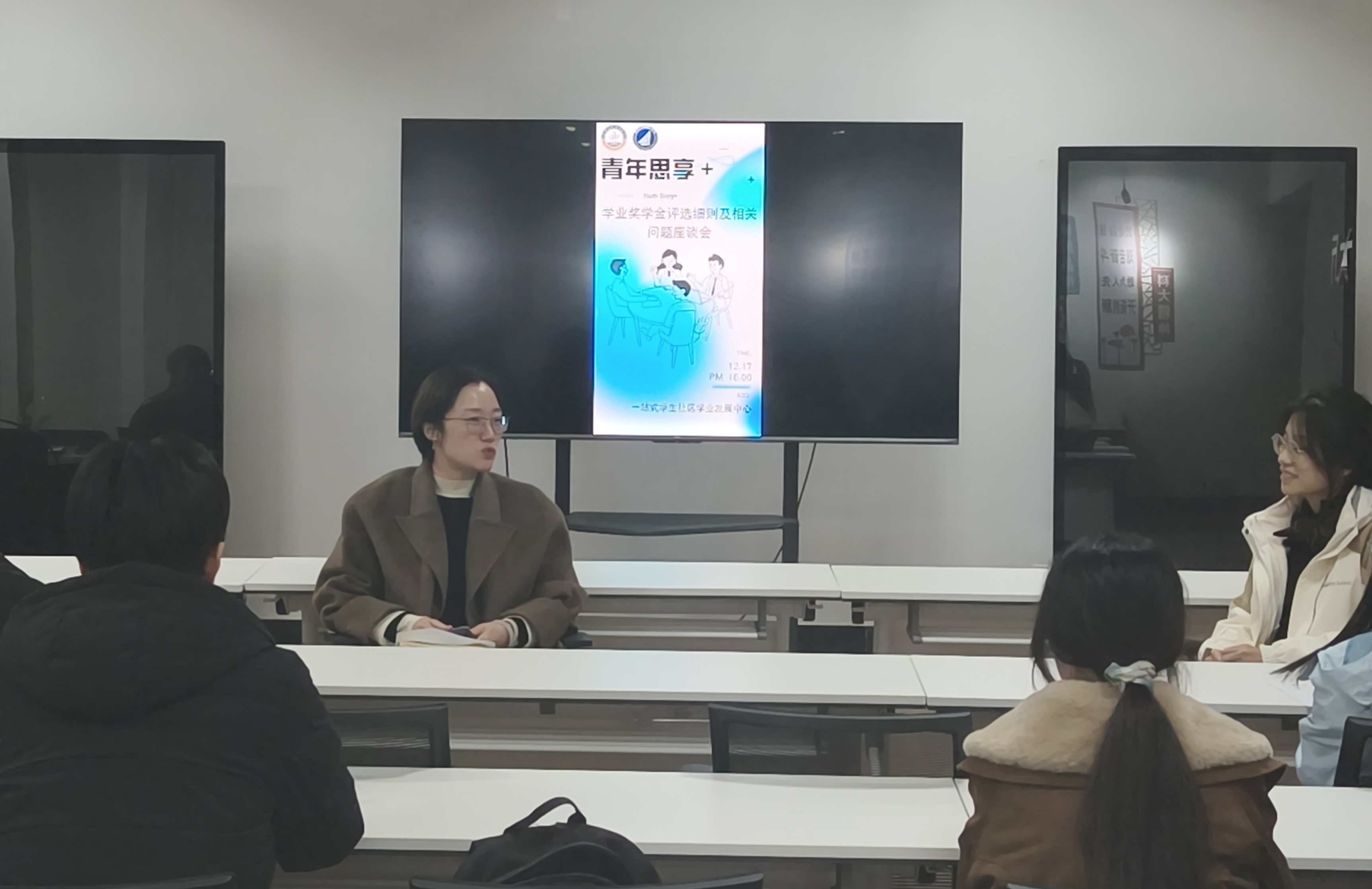 针对往年评奖申报中高频出现的成果署名认定、加分项界定、异议申诉渠道等疑问,座谈会设置专项答疑环节。顾姗姗结合具体案例与政策条款逐一回应,逻辑清晰、针对性强。同时,鼓励同学们结合自身实际踊跃提问,针对现场提出的个性化问题,均给予细致解答,切实打通了申报路上的“堵点”“难点”,让政策解读更接地气、更具实效。