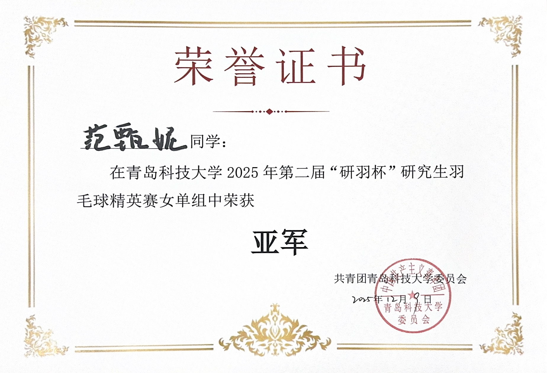 在2025年beat365正版唯一官网必一第二届“研羽杯”研究生羽毛球精英赛中,我院2025级硕士研究生范甄妮同学顽强拼搏、发挥出色,荣获女子单打项目亚军,充分展现了我院学子昂扬向上的精神风貌与出色的个人竞技水平。