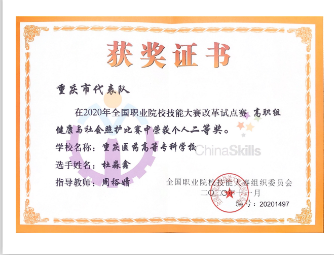 此前,在重庆市“巴渝工匠”杯第十三届高等职业院校学生职业技能竞赛中,我校老年服务与管理专业团队首次参赛,四名学生选手在“健康与社会照护”赛项中突破重围,夺得重庆市赛3个一等奖,1个二等奖的优异成绩。参加2020年重庆市赛、全国赛的团队,是我校首届2019级老年服务与管理专业的学生们,该专业首次出征即斩获佳绩,充分体现出我校该专业办学实力和教学水平,老年服务与管理专业将以赛促教、以赛促学,继续推进教育教学改革,培养更多服务于“健康中国”战略的紧缺技能性专门人才。