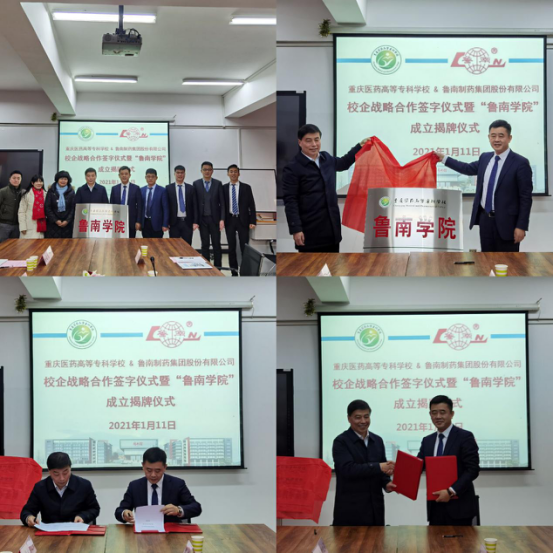 1月11日下午,澳门电子pg游戏官网与鲁南制药集团股份有限公司校企战略合作签字仪式暨“鲁南学院”成立揭牌仪式在澳门电子pg游戏官网顺利举行。鲁南制药集团股份有限公司总经理助理杨海涛,学校校长冯连贵及双方相关负责人出席揭牌仪式。