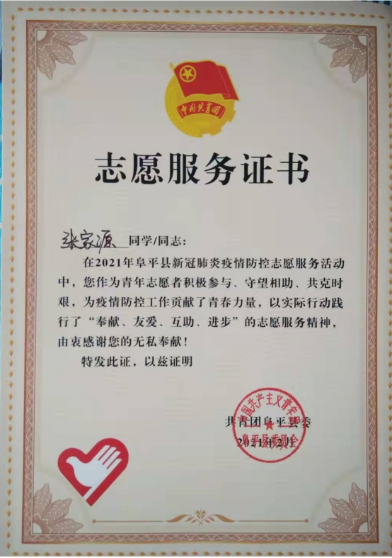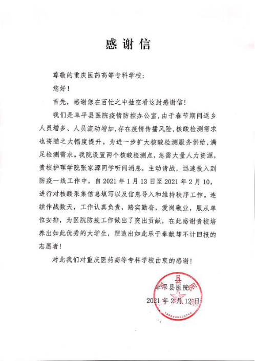 2021年新年伊始,河北疫情告急,恰逢寒假期间,家住河北省阜平县的我校护理学院2019级8班张家源同学,刚一回到家乡便自愿报名请战,积极参加当地防疫办公室组织的抗疫活动。1月13日-2月10日,张家源积极协助当地相关机构进行核酸采集信息填写以及信息导入和秩序维持工作,其认真负责的工作态度获得了身边工作人员的一致好评。河北省阜平县团委和阜平县人民医院先后向其颁发了志愿服务证书和抗疫荣誉证书,阜平县人民医院还专门给学校送来了感谢信,对学校表示由衷的感谢。