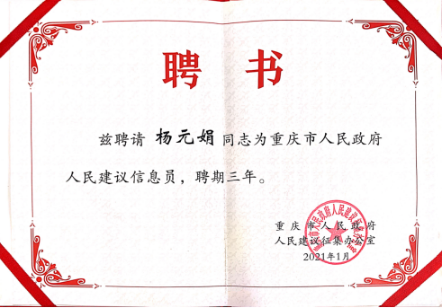 经学校遴选,重庆市教委审核,重庆市政府人民建议征集办公室审批,我校临床医学院院长杨元娟教授获聘重庆市人民政府人民建议信息员。