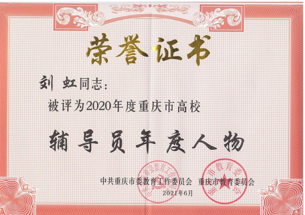 近日,我校辅导员刘虹在2020年度重庆市高校辅导员年度人物评选中脱颖而出,荣获“2020年度重庆市高校辅导员年度人物”荣誉称号,这也是我校首度获得此项荣誉。