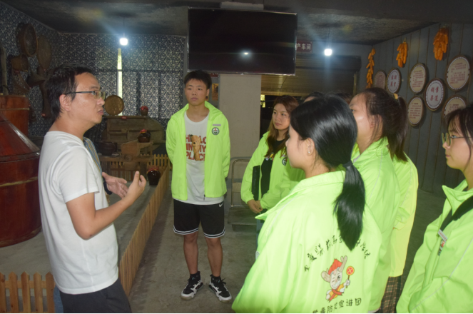 参观集体企业,助推乡村经济。服务队志愿者们在乡村振兴驻村工作队的带领下,参观了该村的集体企业——马武火老二白酒有限公司,深入酒窖了解粮食酒的传统制造流程和工艺,对乡村特色企业发展有了更深的见解,还从抖音微信促宣传,直播带货促销路,提出了建议。