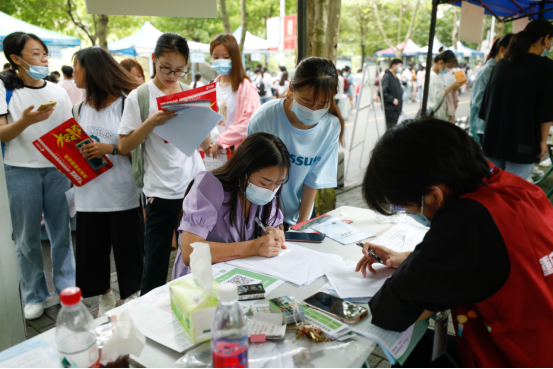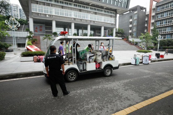 迎新现场,各学院与相关部门在校园主干道、学生宿舍、食堂等处设立迎新服务点,为新生们办理入学手续,提供咨询、导引服务。为更好服务新生,今年学校准备了接驳车,往返于学校南门与学生宿舍为新生们运输行李,还设立服务点为新生们提供免费水饮。