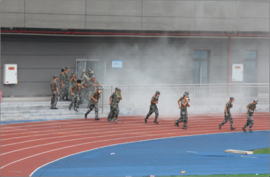 下午14时30分,演练正式开始。宿舍内升起了滚滚浓烟,消防警报随即拉响,参与此次演练活动的4853名学生手捂湿毛巾,在教官的引导下,迅速有序地疏散到了楼前空旷的足球场地。