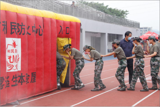 紧接着邓成瑞教官讲解了常用消防器材使用方法及实际操作灭火器。同学们积极参与了灭火器的使用及逃生屋体验。整个活动按照预定方案有序开展,展现了我校新生较好的消防应急逃生素养。