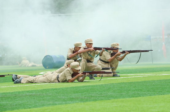 在庄严的国歌声中,五星红旗缓缓升起,2021级新生军训汇报表演正式开始。分列式表演环节,所有方队步履铿锵、气势如虹,整齐划一地走过主席台接受检阅。随后,整齐灵动的健身操、喊声震天的擒敌拳、热血澎湃的情景剧《战火中的青春》、变化多样的队列操,一个个精彩的表演赢得现场阵阵掌声。