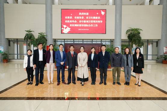 10月15日下午,在重庆市卫生健康委国合处的大力支持和协调下,市教委国际处处长李斌、市卫生健康委国合处处长杨彬、副处长张峰涛、市商务委外经处副处长陈功铭、市政府外办欧非处副处长李岚、四级调研员张璨、市中新项目管理局信息通讯部副部长刘智卿来校调研指导学校国际交流与合作工作。现场调研会在学校综合楼南楼315会议室进行,学校党委书记吴海峰、校长冯连贵、副校长何坪出席会议,党政办、教务处、人事处、科技产业部以及各二级学院负责人及相关人员参加了座谈会,会议由市卫生健康委国合处处长杨彬主持。