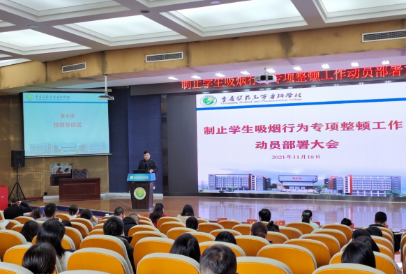 为树立和展现学校师生良好的精神面貌,养成良好文明的生活习惯,创造文明、洁净、优美的校园环境,11月18日下午,学校图书馆学术报告厅举行了“制止学生吸烟行为专项整顿工作”动员部署大会。学校党委副书记黄萌,有关职能部门负责人,各院部(校区)党总支(直属党支部)书记、副书记、非毕业年级辅导员、学生代表参加了启动仪式。启动仪式由学生处处长陈立书主持。