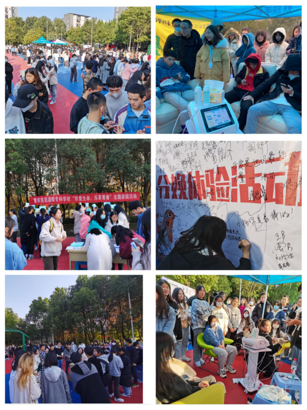 为了充分地展现大学生积极向上、生机活泼的精神风貌,丰富同学们的业余文化生活,提高身心健康素质,增强同学们的团队合作精神和团队凝聚力,营造出和谐的校园文化氛围,11月25日、26日,学校在灯光篮球场开展了“珍爱生命,乐享青春”主题游园会,全校学生有900余人参加了活动。