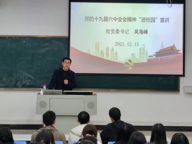 12月15日上午,学校党委书记吴海峰走进我校2021级学生“思想政治理论课”课堂,对党的十九届六中全会精神进行主题宣讲。
