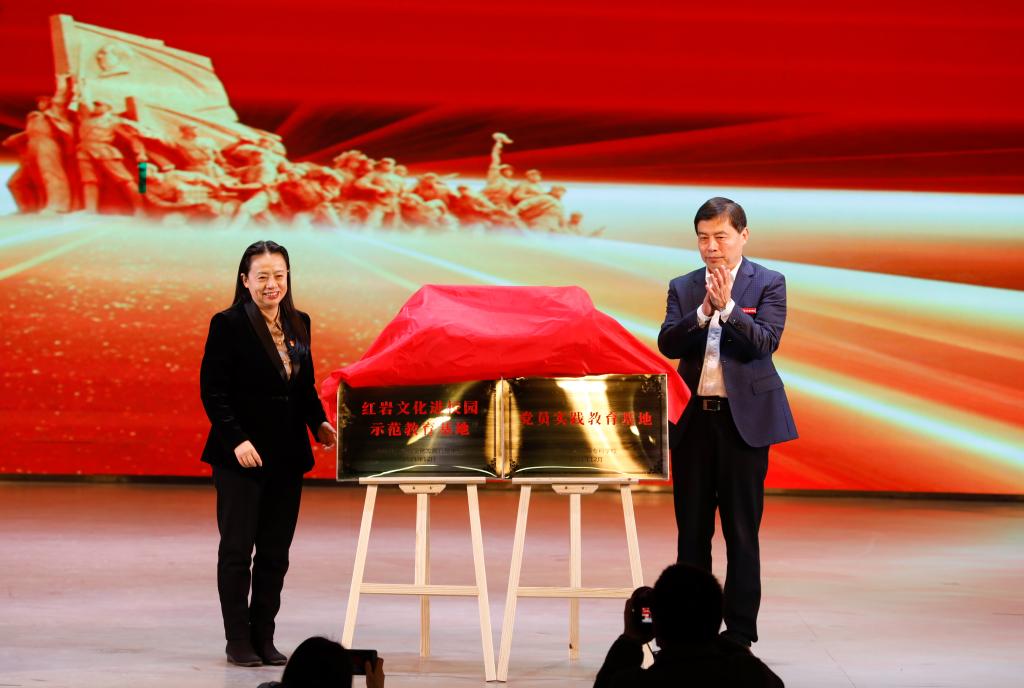 学校校长冯连贵与红岩联线文化发展管理中心主任雷莹为“红岩文化进校园示范教育基地”“澳门电子pg游戏官网党员实践教育基地”揭牌