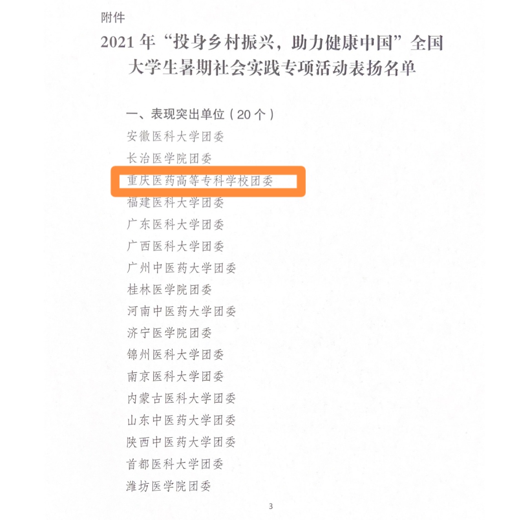 其中,学校校团委“医路黔行”乡村振兴实践团、药学院(中药学院)石柱沙子服务队、护理学院綦江总队、中医学院“岐黄”医疗服务队4支服务队成功入选2021年“投身乡村振兴,助力健康中国”全国大学生暑期社会实践专项活动,因成绩突出,获团中央表扬通报。学校团委获评“表现突出单位”,药学院(中药学院)薛惠元老师获评“表现突出指导教师”。