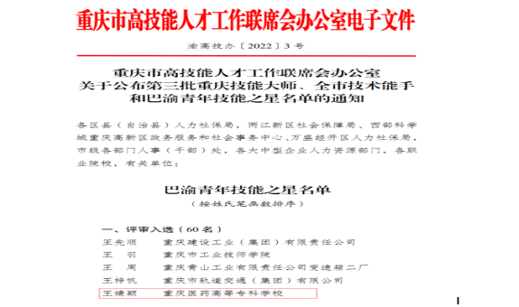 近日,重庆市高技能人才工作联席会办公室公布第三批重庆技能大师、全市技术能手和巴渝青年技能之星名单,我校医学技术学院王婧颖老师入选。