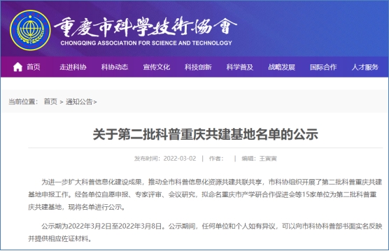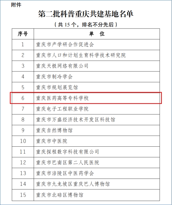 为进一步扩大科普信息化建设成果,推动全市科普信息化资源共建共联共享,2021年12月市科协组织开展了第二批科普重庆共建基地申报工作,经评审,我市15家单位入选第二批科普重庆共建基地。我校临床医学院牵头申报的“急救科普教育培训基地”成功入选第二批科普重庆共建基地。