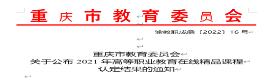 近日,重庆市教育委员会公布2021年重庆市高等职业教育在线精品课程认定结果,马克思主义学院申报的3门课程全部被认定为市级精品在线开放课程。