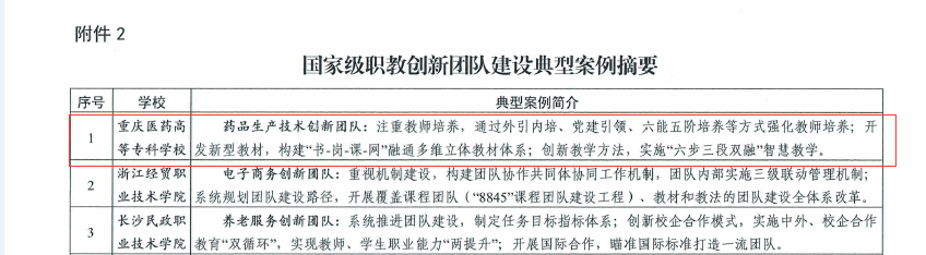近日,教育部教师工作司公布了“职教教师队伍建设经验做法和创新团队建设典型案例”,我校药品生产技术创新团队建设案例成功入选教育部首批国家级职教创新团队建设典型案例(排名第一)。