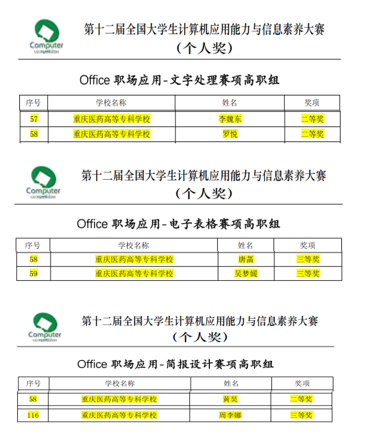 自5月起,基础部组织教师对我校遴选出的6名优秀选手进行指导、培训。经过激烈比拼,我校2021级针灸推拿专业师承班李魏东、2021级食品检验技术专业1班罗悦均获office职场应用-文字处理赛项二等奖;2021级药学专业3班黄昊、2021级护理专业中加班周李娜分别获office职场应用-简报设计赛项二、三等奖;2021级护理专业11班吴梦媛、2021级护理专业9班唐菡均获office职场应用-电子表格赛项三等奖。