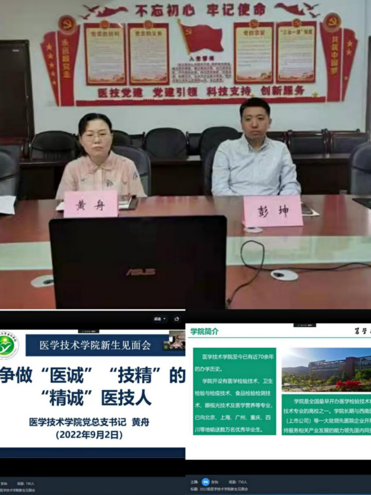 秋风送爽育桃李,丹桂飘香盼学子。9月2日上午9时,医学技术学院通过网上见面会的形式,欢迎来自大学城校区和沙坪坝校区的870余名2022级医技学子。见面会上,学院党总支书记黄舟,院长彭坤分别致辞。黄舟书记结合8月重庆人民灭山火、抗疫情,众志成城,铸就精神长城的感人事迹,为同学们上课一趟生动的思政课,同时提出了做“医诚”“技精”的“精诚”医技人,“医诚”是根本,“技精”是关键,为同学们在大学的求学生活指明了方向。彭坤院长对医学技术学院的历史沿革、教学条件、师资力量、专业发展等多个方面做了详细介绍,并对同学们在大学的学习和生活提出了希望。