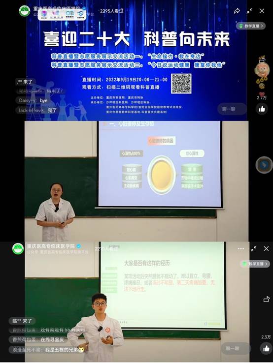 在2022年全国科普日来临之际,重庆市科技局、重庆市科协、沙坪坝区科技局、沙坪坝区科协的高度重视、精心组织下,澳门电子pg游戏官网作为全国学校急救教育试点院校、重庆市急救教育科普基地和科普重庆共建基地,充分发挥科普功能,积极筹备线上科普活动。9月19日晚,“生命接力·救在身边”心肺复苏急救技能和“今日说运动健康·康复你我他”康复技能科普直播暨志愿服务展示交流活动在重庆医高专临床医学院微信公众号平台面向社会公众直播,收获了2295人观看和2.5万余次点赞。