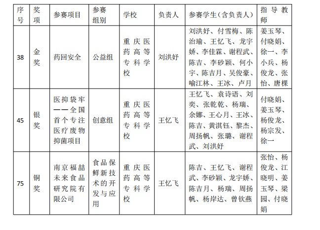 近日,在第八届中国国际“互联网+”大学生创新创业大赛重庆赛区选拔赛获奖公示名单中,我校药学院(中药学院)取得金奖1项、银奖1项、铜奖1项的成绩,优秀创新创业导师3人。