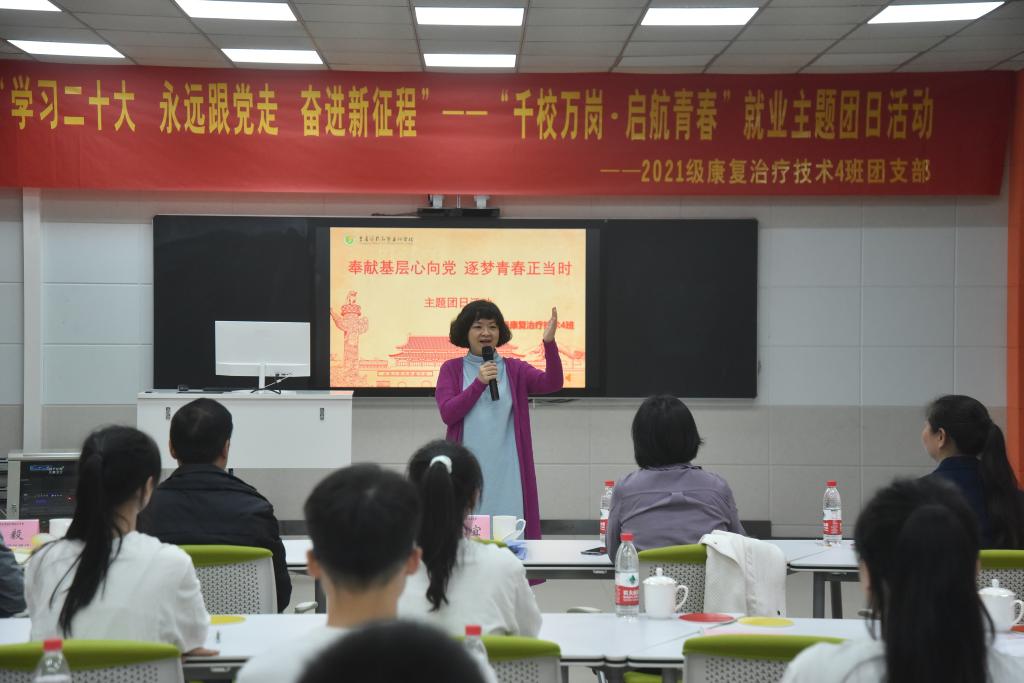 黄永宜一行出席了临床医学院2021级康复治疗技术4班团支部“奉献基层心向党,逐梦青春正当时”主题团日活动,通过观摩就业主题辩论、基层工作情景剧以及基层就业故事分享,深入了解医学生学习现状、就业意愿,了解2022届毕业生就业去向,关心团员青年的职业理想。黄永宜与学子们分享了深入学习贯彻党的二十大精神的认识体会,强调团支部要聚焦思想引领和就业需求,常态化开展就业主题团日活动,号召医学生加强专业学习,志存高远,脚踏实地,毕业后主动深入基层,勇于到农村和社区工作,壮大基层医疗卫生队伍,助力健康中国建设,让青春在全面建设社会主义现代化国家的火热实践中绽放绚丽之花。