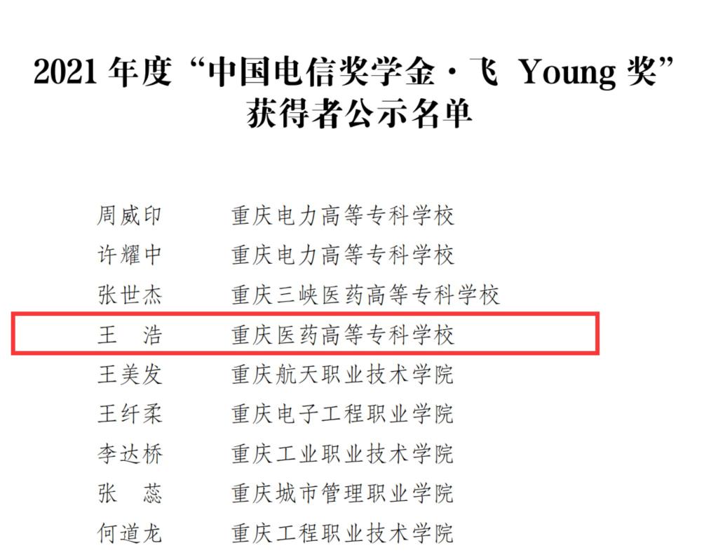 近日,由共青团中央、中国电信集团有限公司、全国学联联合开展的2021年度“中国电信奖学金”遴选结果正式揭晓,我校临床医学院学生王浩获得此项奖学金,全市高职高专院校仅21名学子获此殊荣。