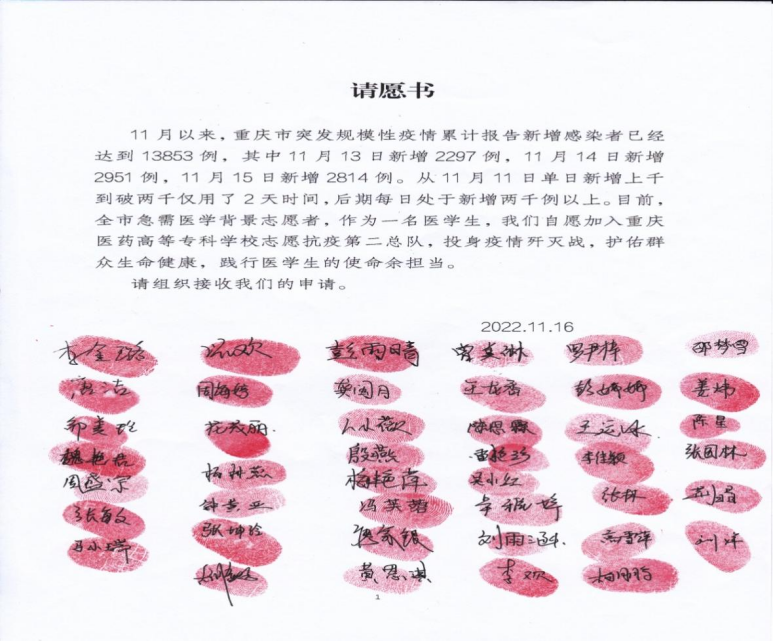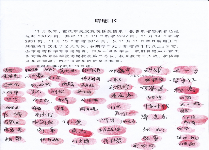 志愿有我,战“疫”同行。每个人参加“志愿红”,换来大家“健康绿”。医学技术学院全体在校学生积极响应倡议,纷纷请愿,携手同心,众志成城,踔厉奋发、毅勇前行。纷纷表示,定会牢记学校嘱托,牢记医专人身份,同母校、同全市共同筑牢疫情防控屏障,共同守护好我们的美丽家园。