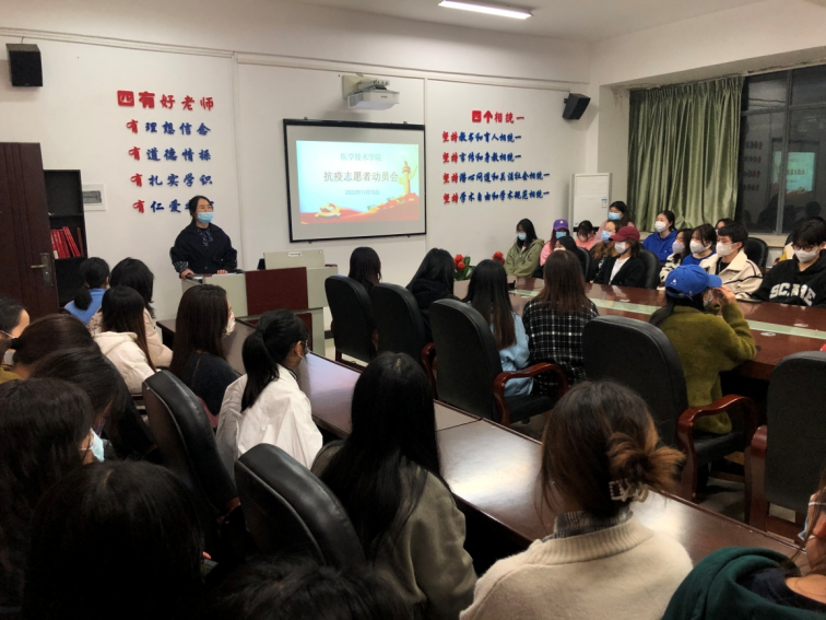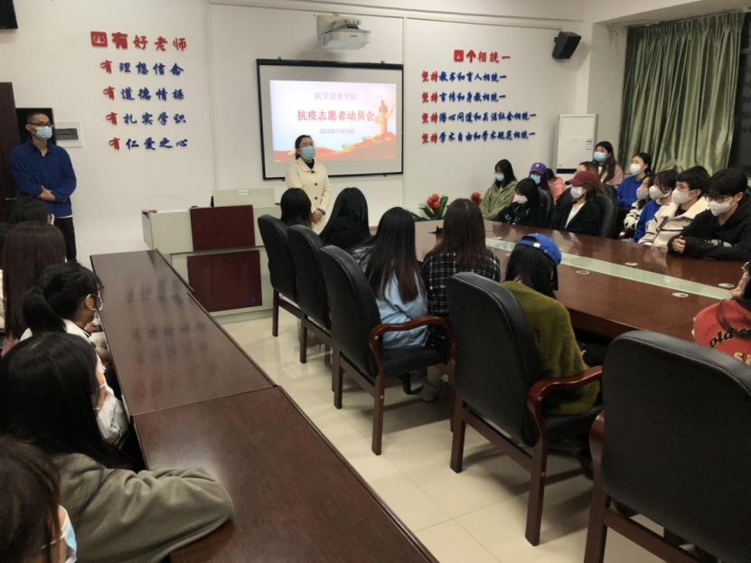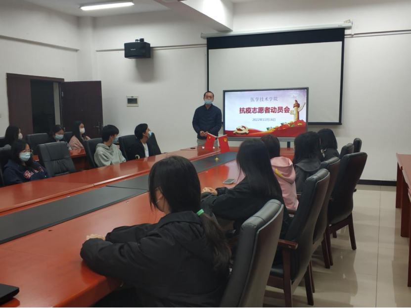 当前,全市疫情形势严峻复杂,防控工作正处于最紧要的关键时期。为积极响应全市号召,大力支援疫情防控工作,护佑群众生命健康,医学技术学院于2022年11月16日晚,分别在学校综合楼南楼315、502室开展防疫志愿者动员大会。