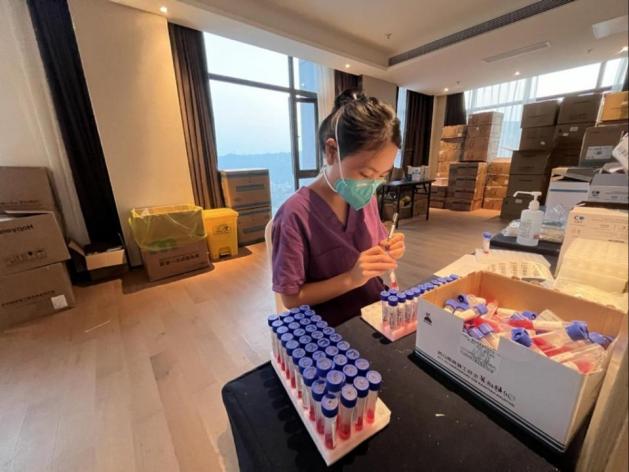 “11月11日早上6点多起床给客人做核酸,10点左右临时接到通知,要转运一批阳性人员出去。救护车在外面只能等十分钟,情况很紧急。我就很慌,可能这段时间连轴转有点累,也有点体力不支。”孙雪萍同学回忆当时的情况,转运阳性人员,核心区里只有她一个人,背着消杀桶,还抱着一堆东西。手里的东西不小心掉在地上,她就俯身趴下去捡,背上的消杀桶太沉,压得她一时无法起身,挣扎了一下,还是努力用手撑地,爬了起来。“当时内心特别无助,其实也有点想哭,我也是个女孩子嘛。从上班后就没回过家,那一刻也挺想爸爸妈妈的。但想到其他同事都在忙,我就想着一定要坚持下去!”孙雪萍同学乐观的说道。